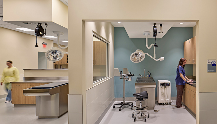 The building was designed to blend into the beautiful natural surroundings and features oversized windows that bring plenty of natural light and views of outdoors to pets and people inside. Above the kennel areas, skylights and solar tubes add even more natural lighting for the animals. The center also makes extensive use of tiled and resinous surfaces to withstand frequent wash downs.